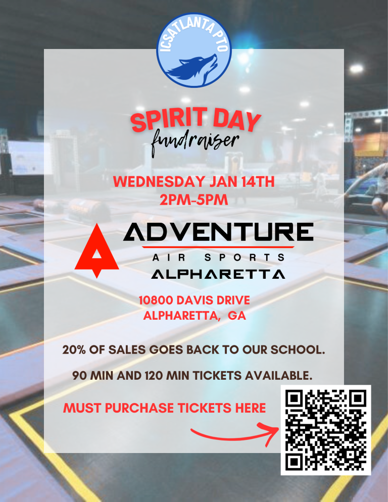 Upcoming ICSAtlanta PTO Events Click image for more information about the race! Click image to register. Virtual Silent Auction Goal Fundraiser Goal: $4,000 Goal of $4,000 0% Wednesday January 14- Spirit Night at Adventure Air 2pm-5pm10800 Davis Dr, Alpharetta, GA 3000960 minute and 90 minute tickets available. You must purchase tickets HERE. Monday February 2nd – PTO Virtual Member Meeting @ 7pm via Google Meets. March 1-14 – Silent Auction Fundraiser Friday March 13th – Race packet pick-up – 3-7pmNew Balance Store, 7300 North Point Pkwy, Unit 119, Alpharetta, Ga 30022 Saturday March 14th – Race packet pick-up – 10am-12pmNew Balance Store, 7300 North Point Pkwy, Unit 119, Alpharetta, Ga 30022 Sunday March 15th – Run the World and 5K Race Fundraiser Thanks to your support, our recent Spirit Nights were a hit! Together we raised:King of Pops: $203Jeni’s: $424Cozy Coop: $300Chipotle: $174🍔Shake Shack: $258That’s over $1,000 back to our school!