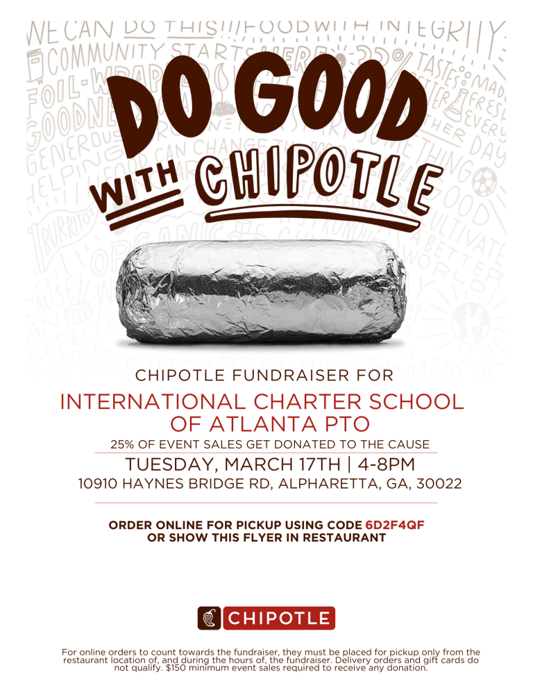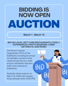 Upcoming ICSAtlanta PTO Events Click image for more information about the race! Click image to register. Virtual Silent Auction Goal Fundraiser Goal: $5,000 Goal of $5,000 0% March 1-14 – Silent Auction FundraiserFriday March 13th – Race packet pick-up – 3-7pmNew Balance Store, 7300 North Point Pkwy, Unit 119, Alpharetta, Ga 30022 Saturday March 14th – Race packet pick-up – 10am-12pmNew Balance Store, 7300 North Point Pkwy, Unit 119, Alpharetta, Ga 30022 Sunday March 15th – Run the World and 5K Race FundraiserTuesday March 17th – Spirit Night @ Chipotle – 4-8pm10910 Haynes Bridge Road – Use code 6D2F4QF to order online for pickup Thanks to your support, our recent Spirit Nights were a hit! Together we raised:King of Pops: $203Jeni’s: $424Cozy Coop: $300Chipotle: $174🍔Shake Shack: $258That’s over $1,000 back to our school! THANK YOU TO OUR 2026 RACE SPONSORS