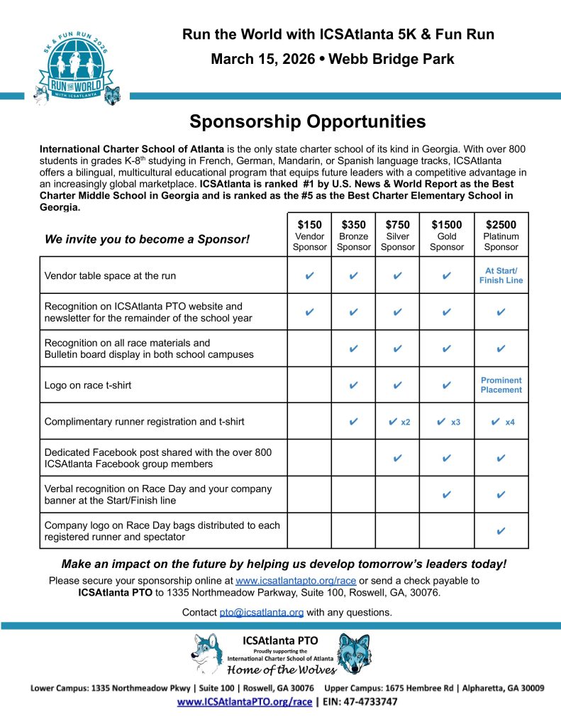 Race Sponsorship Opportunities Vendor Sponsor $150 Bronze Sponsor $350 Silver Sponsor $750 Gold Sponsor $1,500 Platinum Sponsor $2,500